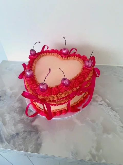 Red heart-shaped cake with decorative frosting and black ribbon bows on a silver cake stand.