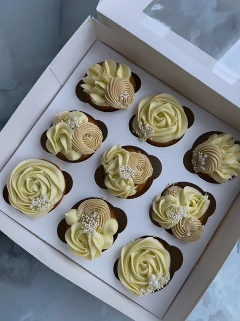 Box of cupcakes and a small cake decorated with pastel pink and yellow frosting and pearl-like sprinkles, designed for Mother's Day.