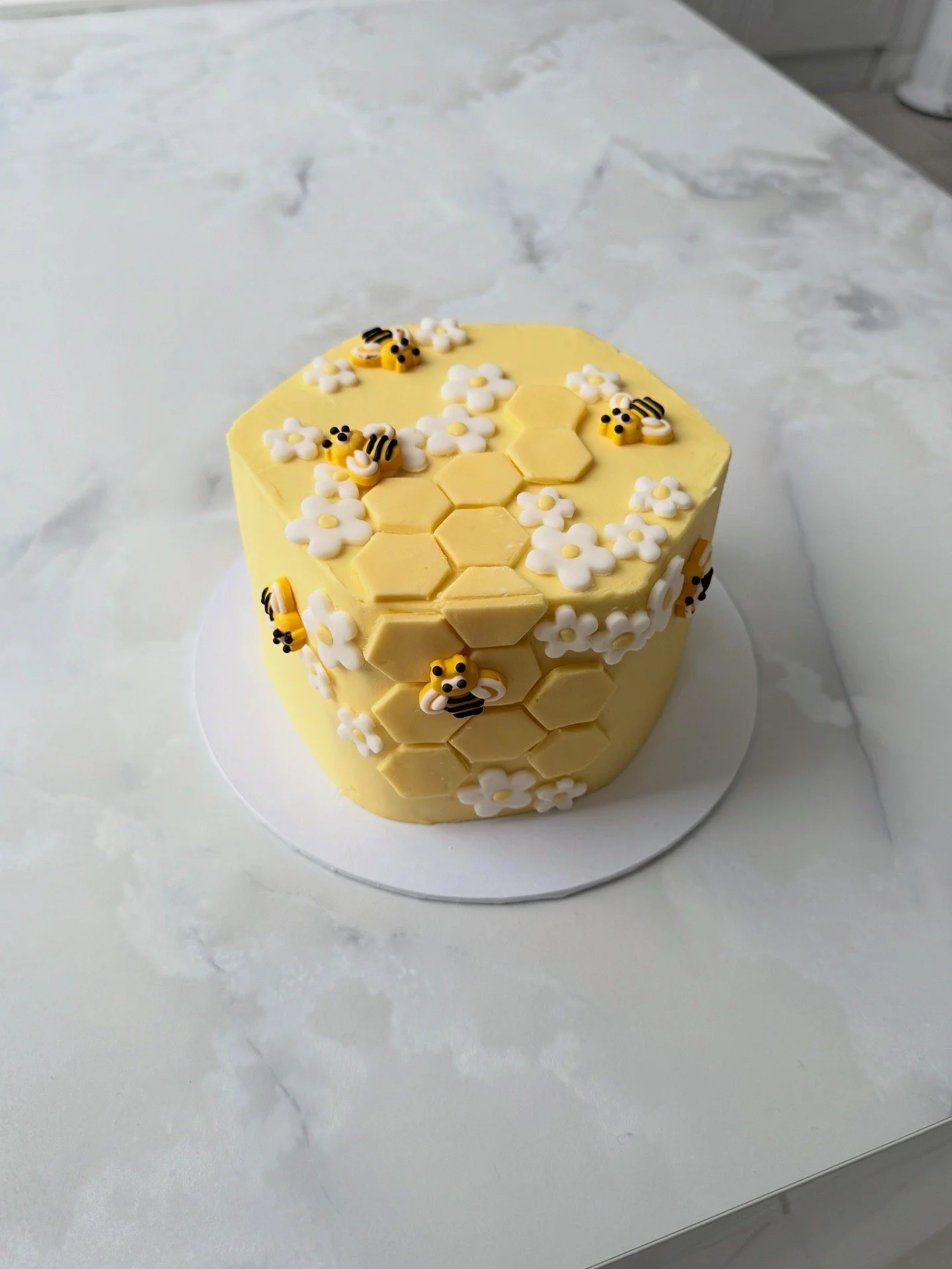 A variety of decorative cakes displayed on wooden slabs. The table features cake pops styled as 'Hunny' pots with tiny honey drippers, a white cake adorned with colorful sugar decorations, and some cupcakes with white frosting. The setting includes a
