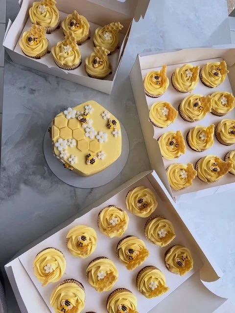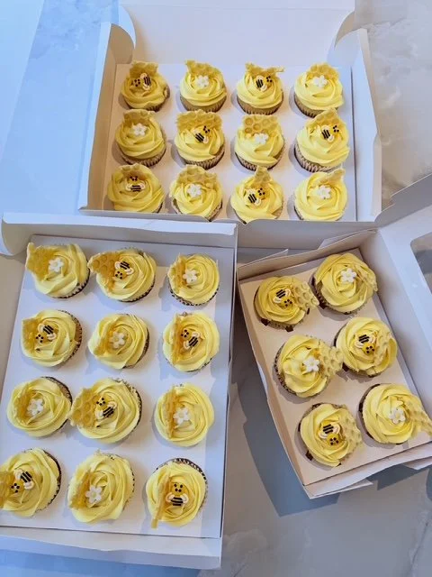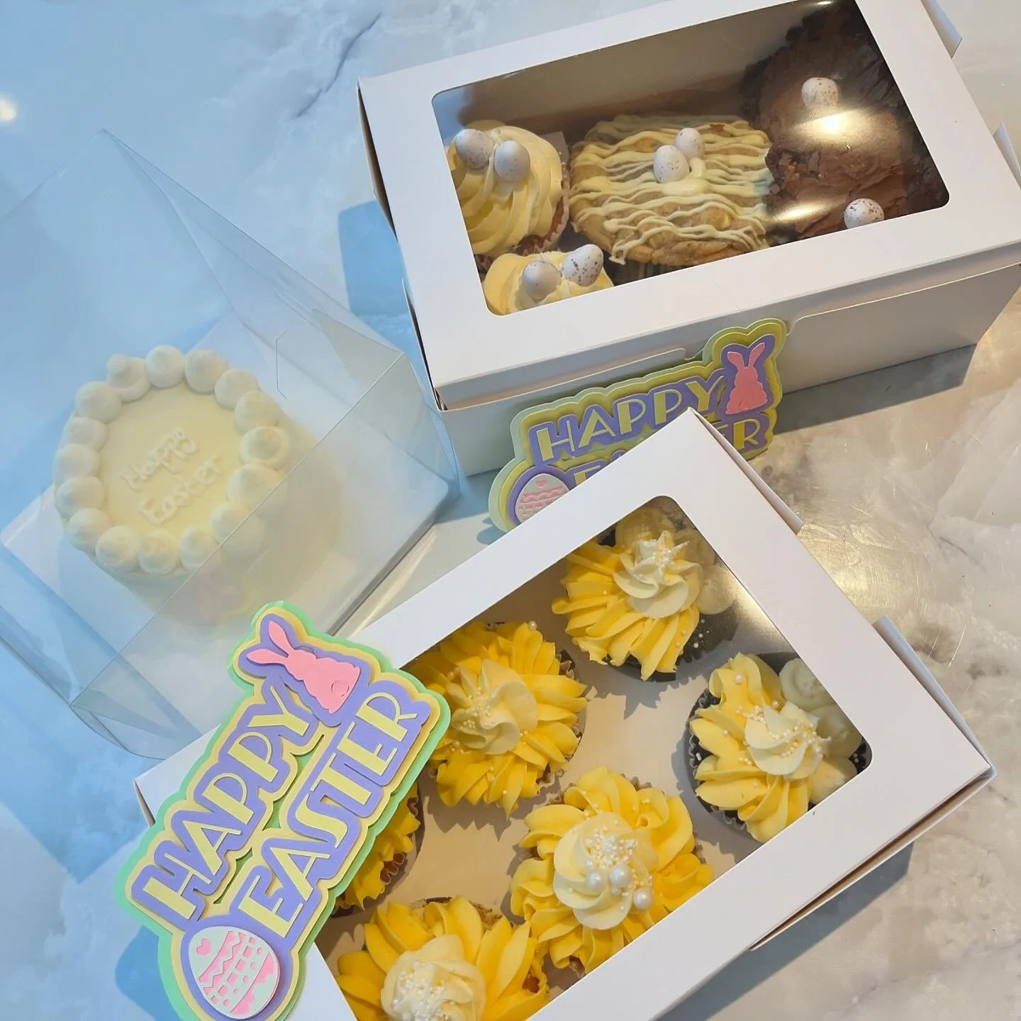 Box of desserts with cupcakes, cookies, brownies, and mini eggs