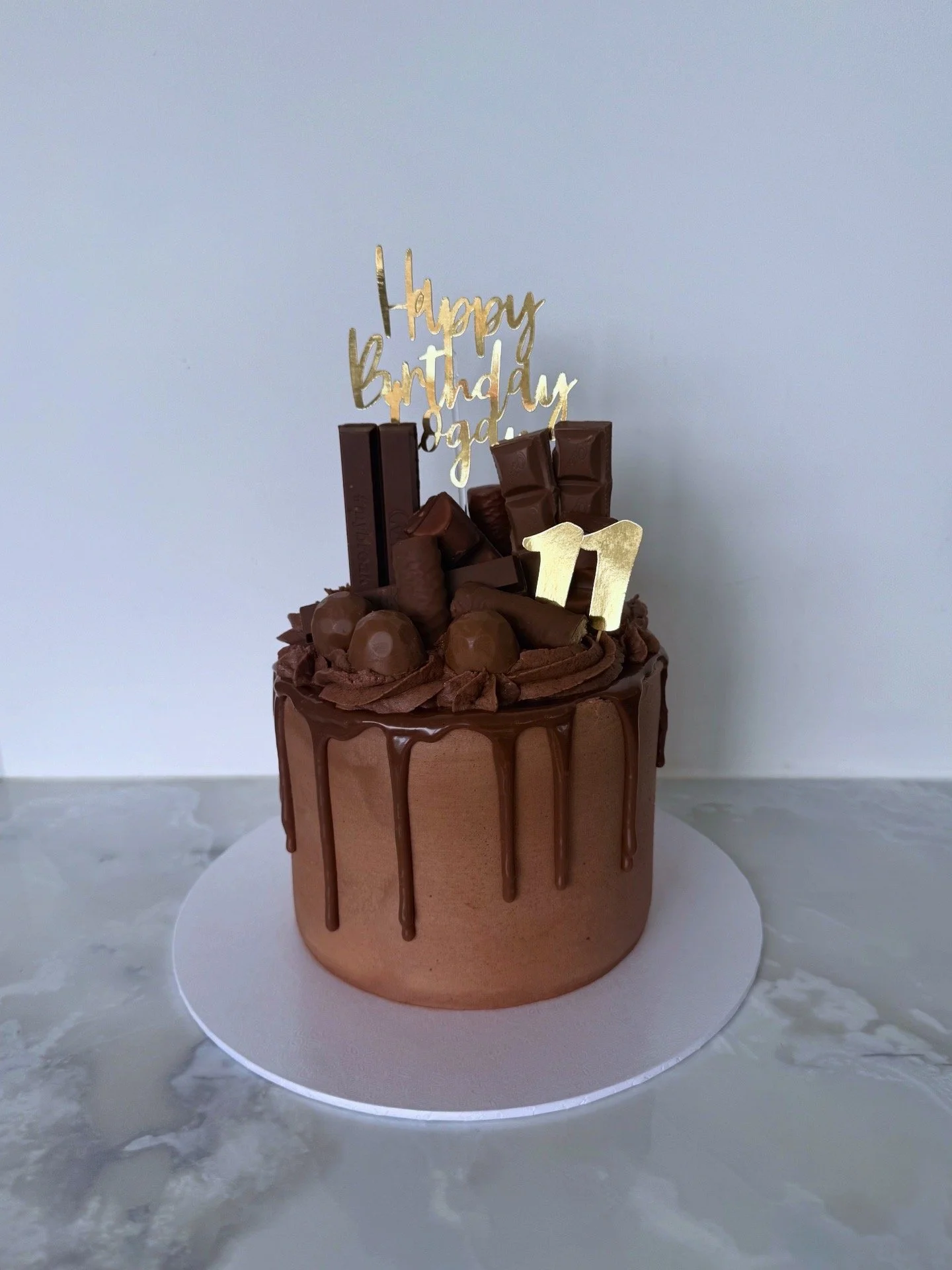 Heart-shaped cake with dark navy frosting, gold pearl decorations, and "Happy Birthday" text topper on a pink background.