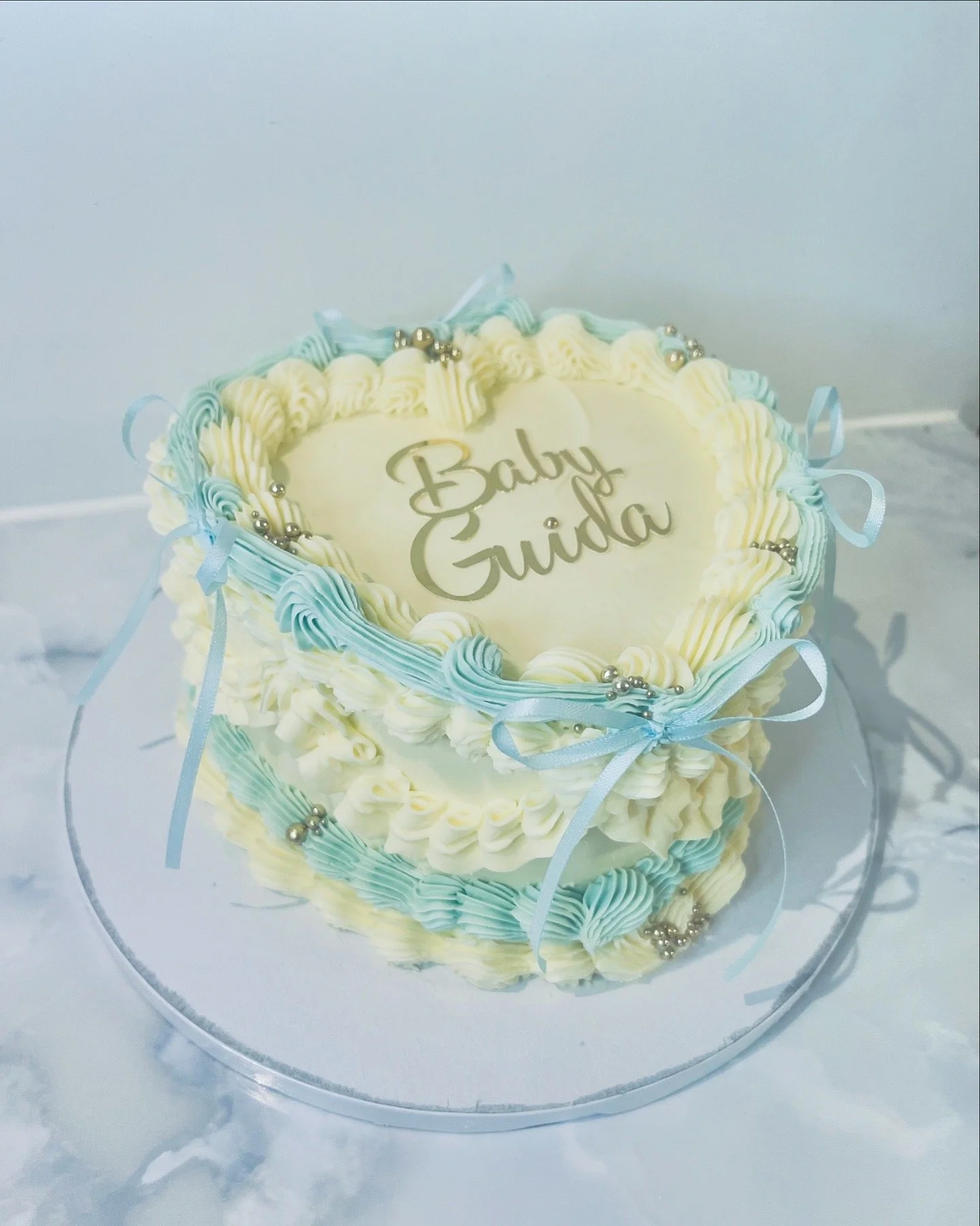 Peach-colored cake with the word 'Baby' on it, decorated with pink, white, and gold spheres, placed on a silver cake stand.